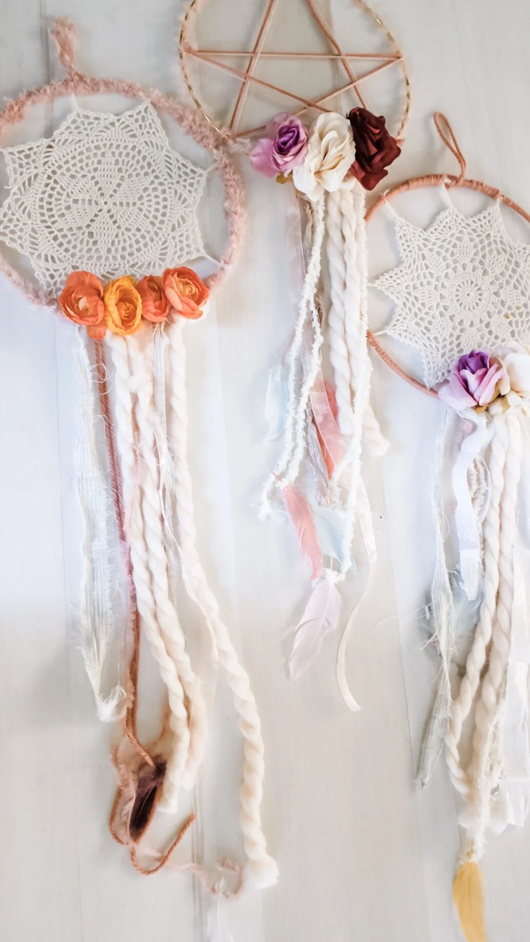 Step three - Create your tails: This is the really fun part! They can use yarn, ribbon, lace, etc. to create “tails” to their dream catcher. They can also tie feathers on or put beads on the string. I loved seeing all of the different ideas. We added in strips of ripped fabric that added a cute “boho” feel.