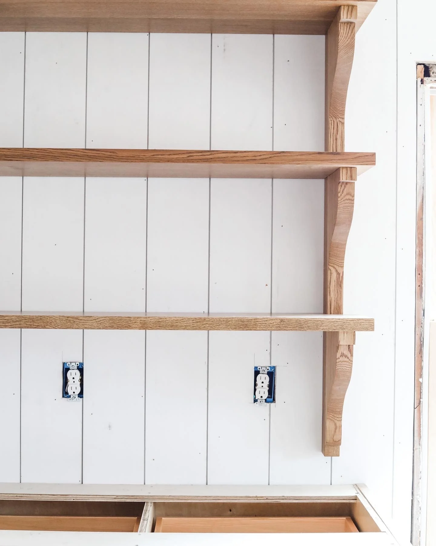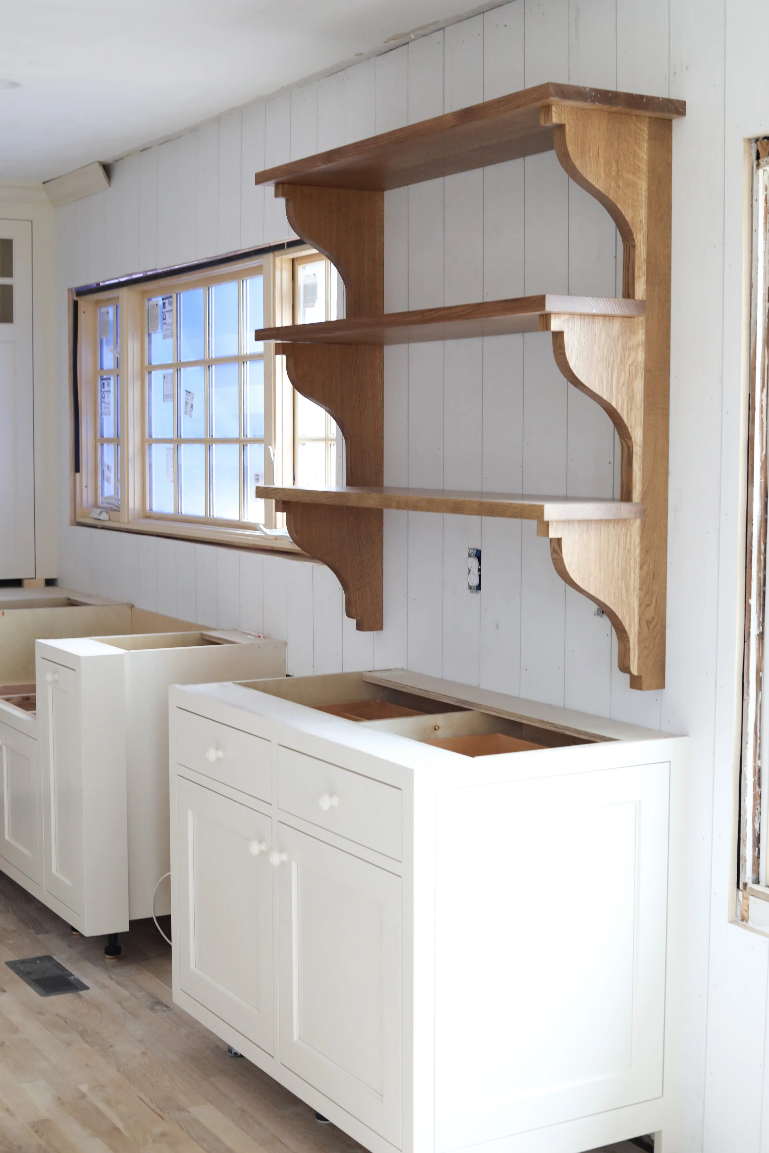 One of my favorite features are these custom shelves that really bring the cottage look I was going for to life. They are stained to match the floors. Can’t wait to style them with cute mugs and cake stands and cook books.